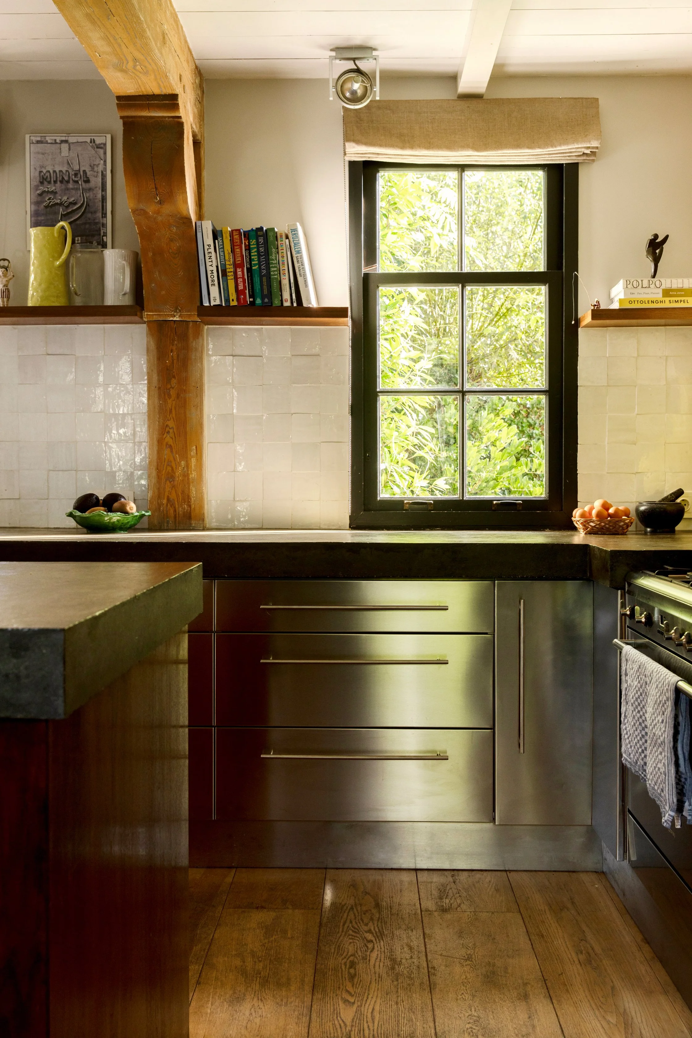 For contrast, the new design introduces sleek stainless steel surfaces, balanced with warm timber and classic tiling. The interplay of materials creates a modern yet sympathetic dialogue with the home’s original details, celebrating its history while giving the kitchen a clean, contemporary edge.